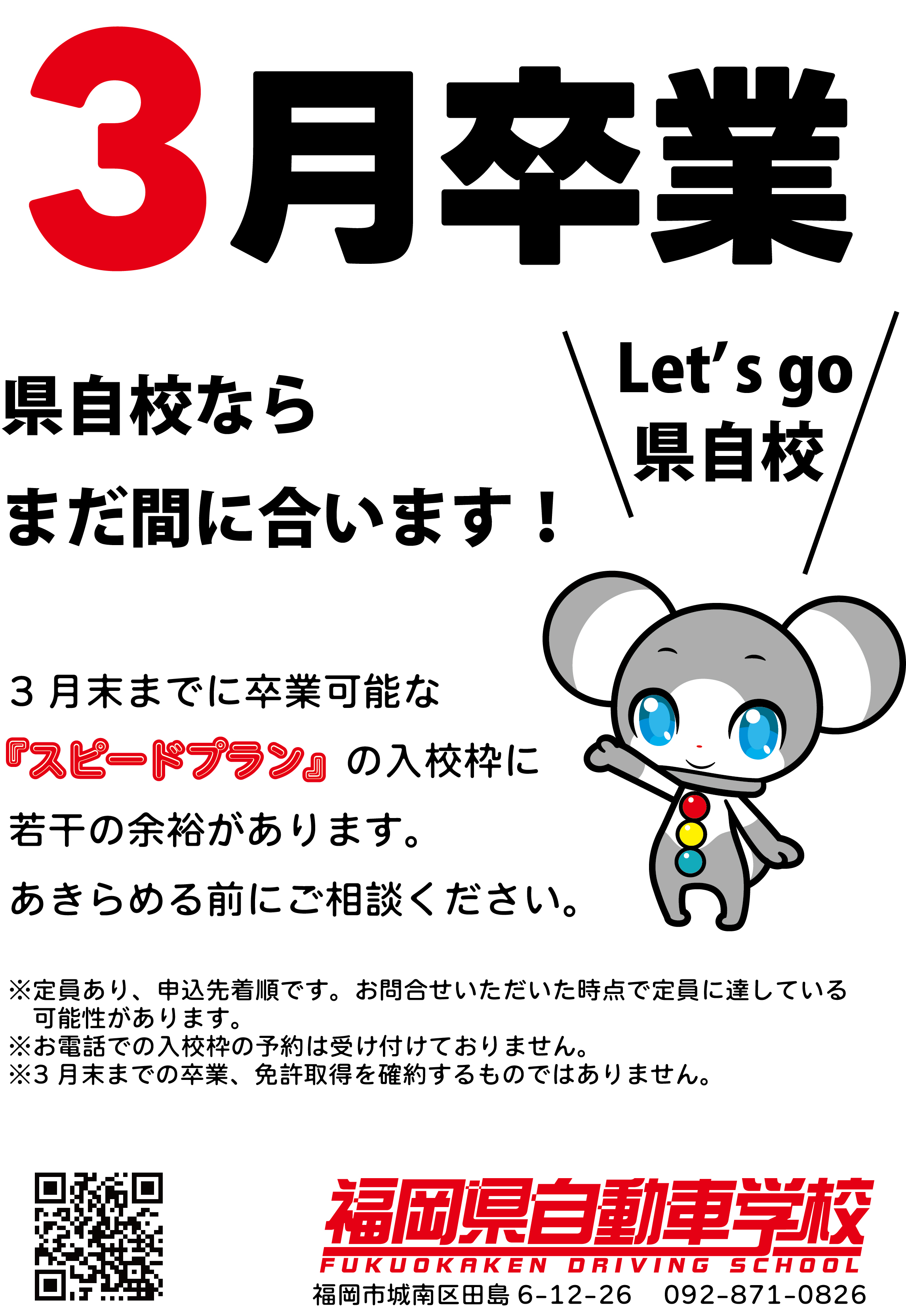 3月中に免許取らなきゃいけない方! 当校にぜひご相談ください。 3月中に卒業できる『スピードプラン』の枠に若干の余裕があります。 詳細はお問い合わせください。