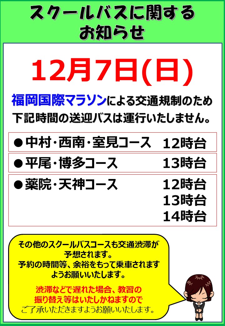 12/7(日)福岡国際マラソンによる交通規制等のため、下記スクールバスは運行いたしません。