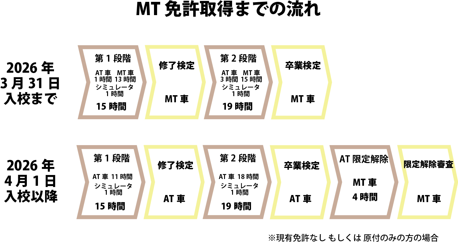 福岡県自動車学校では、来年2026年4月1日から、現行法に基づきMT車の免許はAT車の免許取得後に限定解除を行う方式へと変わります。 現在は移行期間に当たるため、旧法に基づき、当校では教習の大部分をMT車で実施しており、路上教習もMT車でおこなっております。 当校でMT車の免許を取得するためには、1段階で13時間以上、2段階で15時間以上のMT車による教習が必要となります。(現有免許が無い、もしくは原付のみの場合)