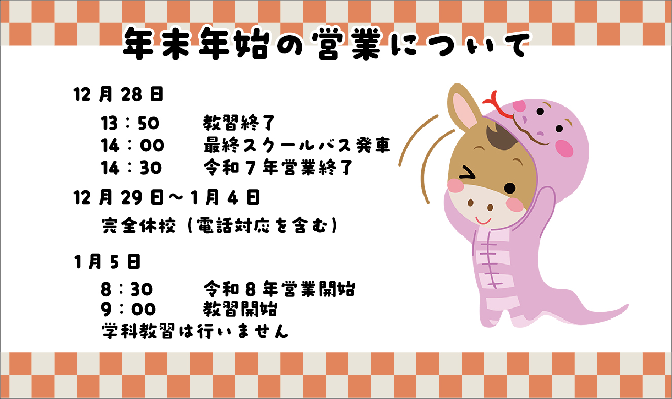 誠に勝手ながら、12月29日(月)から1月4日(日)の間は休校とさせていただきます。 なお、1月5日は月曜日となりますが、現在、多くのお客様にご入校いただいていることを考慮し、開校いたします。学科教習は行わず、技能教習のみの実施となります。